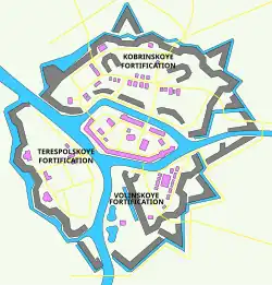 La garnison était composée d'environ 9 000 soldats russes, en comptant l'armée régulière, les gardes-frontières et les agents du NKVD[8].Les soldats soviétiques appartenaient aux 6e (ru) et 42e divisions de fusiliers ainsi qu'au 17e détachement des troupes frontalières du NKVD et à diverses autres petites unités (dont la garnison de l'hôpital et une unité médicale). 300 familles de militaires étaient aussi présentes au sein de la fortification.