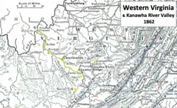 Plus en amont, sur une portion non navigable, la rivière Kanawha prend naissance à la jonction de la rivière New et de la rivière Gauley, au niveau de la localité de Gauley Bridge. Ce point est d’une importance stratégique non seulement en raison de sa position fluviale, mais aussi parce qu’il est traversé par la James River and Kanawha Turnpike, laquelle croise une autre route menant vers le nord-est, en direction de Summersville et au-delà[5]. La portion de la vallée de la Kanawha appartenant alors à la Virginie — incluant Charleston, chef-lieu du comté de Kanawha — est intégrée à la Virginie-Occidentale, fidèle à l’Union, lors de sa création le [6].