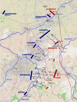Les Français répondent aux avancées d'York et de Clerfayt en lançant une attaque contre les forces d'York avec les divisions Souham et Bonnaud, et les brigades Compère et Thierry, soit toutes les forces disponibles dans la région entre l'Escaut et la Lys. Cependant, Bonnaud est repoussé à la bataille de Willems (en) grâce à l'utilisation habile de la cavalerie par York, ce qui a conduit au retrait des autres unités impliquées dans l'offensive, car la doctrine militaire alors en vigueur dicte que les unités d'une armée doivent avancer et reculer étalées, mais alignées les unes sur les autres, pour exercer une pression égale en tous points sur l'armée ennemie. Bien que victorieux à Willems, York se rend compte qu'il est largement en infériorité numérique, et se retire à Tournai pour appeler des renforts. Le retrait d'York permet aux Français de consacrer désormais toute leur attention à Clerfayt.