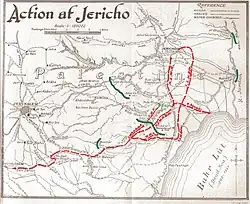 Une tentative de percée britannique (en) à l'est du Jourdain, menée du 30 avril au 4 mai 1918 près de Salt, est tenue en échec par les 24e division d'infanterie et 3e de cavalerie ottomanes dépendant de la 4e armée de Mehmed Djemal Pacha[21]. Une contre-offensive ottomane vers Jéricho, menée par la 24e division ottomane et deux bataillons allemands, est repoussée par les Britanniques et leurs alliés le 14 juillet 1918 à la bataille d'Abou Telloul (en). Cependant, les opérations dans la vallée du Jourdain ne sont que des diversions pendant qu'Allenby accumule des moyens pour une offensive décisive en Palestine centrale : la bataille de Megiddo (19-21 septembre 1918) balaie les 7e et 8e armées ottomanes. Les Ottomans doivent se replier vers Damas et Alep et abandonner toute la Syrie ottomane.