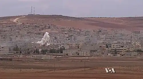 Le , l'aviation américaine effectue au moins cinq frappes sur les lignes djihadistes[107],[108]. Un char de l'État islamique est détruit et 18 hommes sont tués[109],[110],[111], tandis que les combats entre Kurdes et djihadistes font sept morts chez les premiers, cinq pour les seconds[112]. Les affrontements livrés la nuit du au sur les limites de Kobané sont particulièrement violents, une partie des forces djihadistes serait même parvenue à entrer dans la ville[113],[114]. Selon l'OSDH, Kobané et ses villages environnants sont alors vidés de 80 à 90 % de leurs habitants[115]. Les combats ont lieu principalement au sud-est de la ville, au moins sept combattants kurdes et 16 djihadistes sont tués dans la matinée du 2 octobre, et un civil est également tué par l'EI[116],[117]. L'attaque sur la ville est finalement repoussée de justesse, cependant les Kurdes perdent encore six villages et la colline de Zorava, à l'ouest[118].