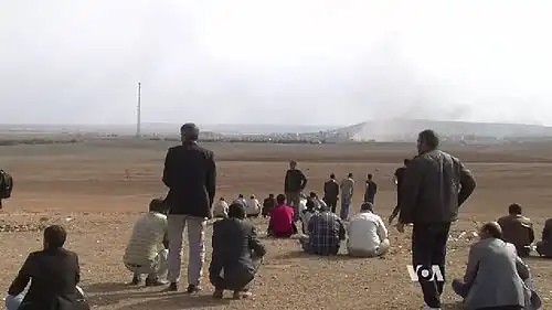 Le , la Turquie ferme sa frontière dans le sens des départs vers la Syrie, afin d'empêcher d'autres combattants kurdes de Turquie de partir se battre à Kobané[67]. Afin de mieux contrôler les flots de réfugiés, les Turcs ferment d'autres postes-frontières et ne gardent ouvert que celui de Mürşitpınar (tr). Le matin du 22 septembre, le nombre des réfugiés kurdes est de plus de 130 000[68],[69]. Selon l'OSDH, deux combattants kurdes et 10 djihadistes sont tués le 21 septembre dans les combats de Kobané[70]. Des heurts ont lieu avec les forces turques, certains kurdes voulant retraverser la frontière pour combattre l'EI[71],[72].
