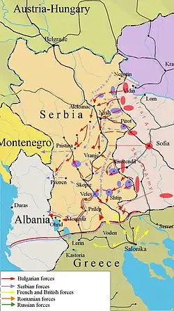 La 1re armée bulgare (en), commandée par Kliment Boyadjiev, entre en Serbie le . Elle franchit la Morava méridionale et avance en direction de Niš et Pristina. L'armée serbe résiste pendant 2 jours à Prokuplje avant de battre en retraite, prise en tenaille entre des forces ennemies très supérieures en nombre. Elle tente une percée vers Vranje et Kumanovo, en Macédoine serbe, en espérant faire sa jonction avec les forces franco-britanniques de Salonique, mais elle est repoussée.