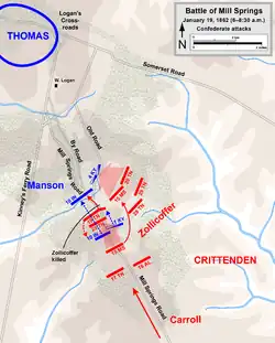 La première brigade de Crittenden était commandée par le général de brigade Felix Zollicoffer, qui avait pour tâche principale de garder le Cumberland Gap. En novembre 1861, considérant que l'endroit était fortifié de façon satisfaisante, ce dernier progressa vers l'Ouest dans l'État du Kentucky afin de se rapprocher des forces confédérées situées à Bowling Green et de renforcer son contrôle dans la zone environnant Somerset. La rive sud de la rivière Cumberland à Mill Springs était en fait une falaise et donc une bonne position défensive tandis que la rive nord était basse, plate et marécageuse par endroits. Zollicoffer choisit de déplacer la majorité de ses hommes vers la rive nord où il serait alors plus proche des forces unionistes, affirmant de manière incorrecte que cet endroit était plus défendable. Crittenden et Albert Sidney Johnston ordonnèrent pourtant à Zollicoffer de se replacer au sud de la rivière mais il ne put le faire, faute d'un nombre suffisant d'embarcations pour traverser rapidement la rivière. Par ailleurs, Zollicoffer craignait que sa brigade soit arrêtée et faite prisonnière par l'ennemi durant la traversée[4].