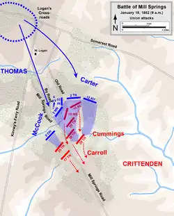 Le général de brigade unioniste George H. Thomas reçut l'ordre de faire traverser ses forces sur la rivière Cumberland et de briser l'armée de Crittenden. Thomas quitta Lebanon et avança lentement à travers un terrain détrempé, n'atteignant ainsi Logan's Crossroads que le , où il attendit les troupes du général de brigade Albin F. Schoepf en provenance de Somerset pour se joindre à lui. Crittenden, resté jusqu'à début janvier dans son quartier général basé à Knoxville, arriva finalement à Mill Springs et réalisa alors que son subordonné inexpérimenté se trouvait dans une dangereuse situation. Il conçut un plan pour attaquer les forces de l'Union avant que celles-ci ne se regroupent pour attaquer; une section de l'armée unioniste et trois brigades sous le commandement de Thomas, étaient situées à Logan's Crossroads; la brigade de Schoepf était quant à elle basée à Somerset, séparée par le Fishing Creek, alors en crue à cause de la pluie, ce qui pouvait constituer une barrière suffisante pour empêcher ces diverses forces armées de faire rapidement leur jonction. Crittenden ordonna à Zollicoffer d'attaquer dès l'aube du 19 janvier le camp de l'Union à Logan's Crossroads[5].