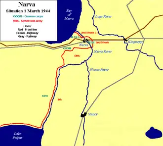 Narva est une ville située en Estonie entre la mer Baltique et le lac Peïpous, point de passage obligé entre la ville de Leningrad (aujourd'hui Saint-Pétersbourg) et l'Estonie. La ville est un carrefour stratégique pour quiconque souhaite parvenir aux pays baltes. La bataille de Narva a pour enjeu la conquête des pays baltes. Après la fin du siège de Leningrad en janvier 1944, la Stavka voit l'occasion de porter la guerre sur les pays baltes et d'anéantir le Heeresgruppe Nord. La bataille est également connue sous le nom de bataille des SS européens. Si la ville de Narva tombe, tout le Heeresgruppe Nord sera menacé d'encerclement et d'anéantissement.