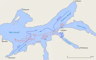 Le Skagerrak avait été retardé d'atteindre Narvik à temps par l'Opérations Wilfred britannique du 8 avril au large de la Norvège[21] - avait également été envoyé en Norvège, en soutien au débarquement allemand à Trondheim, mais il a été intercepté par le croiseur britannique HMS Suffolk, le 14 avril[22] après avoir été redirigé par le commandement naval allemand vers une position d'attente en mer. Lorsque le navire de guerre britannique a tenté d'aborder le Skagerrak, son équipage l'a sabordé à 68° 15′ N, 2° 00′ E. Le Kattegat et le Skagerrak, qui étaient des navires jumeaux, ont été inspectés à Kopervik par le torpilleur norvégien HNoMS Stegg, respectivement les 5 et 7 avril. Le capitaine du Kattegat a dit aux Norvégiens qu'il se dirigeait vers Narvik pour de nouvelles commandes, et le capitaine du Skagerrak a revendiqué Mourmansk comme destination, et les inspections ont révélé que les deux pétroliers avaient une pleine charge de mazout. Le Skagerrak transportait également 165 tonnes de vivres, qui étaient revendiqués comme fournitures pour les navires marchands allemands. Les caisses de nourriture étaient étiquetées "Wehrmacht"[23],[24]. Selon le plan allemand, les destroyers étaient supposés avoir été ravitaillés par deux pétroliers, Kattegat et Jan Wellem, chacun recevant quelque 600 t de fioul[23].