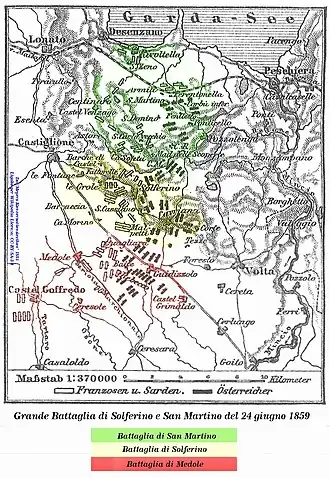 Cette bataille fut remportée le par le général Philibert Mollard. Le premier régiment sarde à entrer en contact avec les Autrichiens est la 29e compagnie de bersaglieri, dirigée par le jeune lieutenant-colonel Raffaele Cadorna qui précède l'avant-garde de la 5e division Cucchiari (it) se dirigeant vers Pozzolengo. C'est l'action qui engage, vers 7 h du matin, une longue et sanglante bataille pour le contrôle de Pozzolengo, menée principalement dans les bourgs de San Martino et Madonna della Scoperta (it). La formation autrichienne, en nette infériorité numérique, est déployée sur des positions dominantes. Le feld-maréchal Benedek mène ses hommes avec beaucoup d'habileté, réussissant à tenir ses positions jusqu'à la fin de soirée, lorsque les armées austro-hongroises se retirent de Solferino, Cavriana, Guidizzolo et Volta Mantovana, se mettant à l'abri au-delà du Mincio.