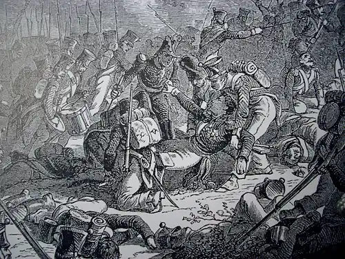 Le général Gudin, mortellement blessé par un boulet de canon, transmet le commandement de sa division au général Gérard. Illustration d'Henri Félix Emmanuel Philippoteaux.