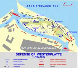 La bataille de Westerplatte est un affrontement entre les troupes allemandes et la garnison polonaise stationnée à Gdansk entre le 1er et le 7 septembre 1939[1]. Cette bataille est la première de la campagne de Pologne. C'est sur la péninsule de Westerplatte, à côté de Dantzig (ou Gdansk) en Pologne, qu'eut lieu le premier affrontement de la Seconde Guerre mondiale[1]. Petite île boisée séparée de Dantzig par le chenal menant au port, Westerplatte était, durant l'entre-deux-guerres, un avant-poste militaire.