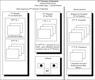 La 2e division d’infanterie est renforcée par la brigade légère de cavalerie de la division de cavalerie du corps d’armée. Au total, le général Douay ne peut compter que sur ses 8 000 hommes, alors qu’une division d’infanterie en comprend normalement 15 000. Ceci est dû à la mauvaise organisation de la mobilisation ; toutes les unités n’ont pas atteint leur effectif de guerre.