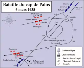 Le même jour, les deux croiseurs nationalistes de classe Canarias, le Canarias et le Baleares, quittaient le port de Palma sous le commandement de l'amiral Manuel de Vierna, accompagnés par le croiseur léger Almirante Cervera et trois destroyers, le Velasco et deux autres de classe Teruel[3]. Ils étaient chargés d'escorter un convoi qui transportait du matériel depuis l'Italie, chargé sur plusieurs navires de commerce, le Umbe-Mendi et l’Aizkori-Mendi. Le Baleares, accueillant normalement 800 marins, embarquait ce jour-là 1 223 hommes, car plusieurs devaient être débarqués à Cadix : il y avait des travailleurs de la Société espagnole de construction navale (Sociedad Española de Construcción Naval) et des jeunes de l'organisation marine de la Phalange espagnole, les Flechas Navales.