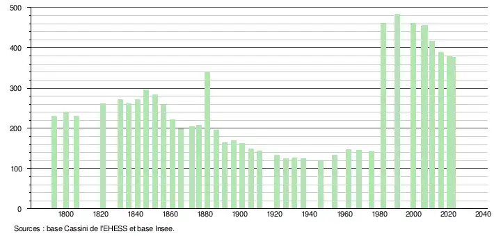 L'évolution du nombre d'habitants est connue à travers les recensements de la population effectués dans la commune depuis 1793. Pour les communes de moins de 10 000 habitants, une enquête de recensement portant sur toute la population est réalisée tous les cinq ans, les populations de référence des années intermédiaires étant quant à elles estimées par interpolation ou extrapolation[17]. Pour la commune, le premier recensement exhaustif entrant dans le cadre du nouveau dispositif a été réalisé en 2005[18].
