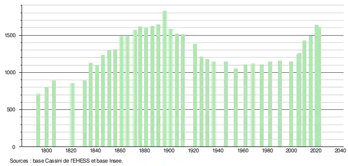 L'évolution du nombre d'habitants est connue à travers les recensements de la population effectués dans la commune depuis 1793. Pour les communes de moins de 10 000 habitants, une enquête de recensement portant sur toute la population est réalisée tous les cinq ans, les populations de référence des années intermédiaires étant quant à elles estimées par interpolation ou extrapolation[34]. Pour la commune, le premier recensement exhaustif entrant dans le cadre du nouveau dispositif a été réalisé en 2005[35].