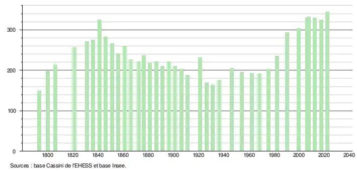 L'évolution du nombre d'habitants est connue à travers les recensements de la population effectués dans la commune depuis 1793. Pour les communes de moins de 10 000 habitants, une enquête de recensement portant sur toute la population est réalisée tous les cinq ans, les populations de référence des années intermédiaires étant quant à elles estimées par interpolation ou extrapolation[33]. Pour la commune, le premier recensement exhaustif entrant dans le cadre du nouveau dispositif a été réalisé en 2007[34].