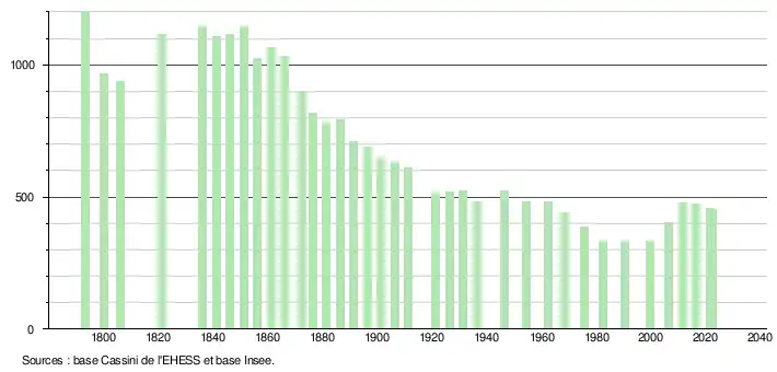 L'évolution du nombre d'habitants est connue à travers les recensements de la population effectués dans la commune depuis 1793. Pour les communes de moins de 10 000 habitants, une enquête de recensement portant sur toute la population est réalisée tous les cinq ans, les populations de référence des années intermédiaires étant quant à elles estimées par interpolation ou extrapolation[41]. Pour la commune, le premier recensement exhaustif entrant dans le cadre du nouveau dispositif a été réalisé en 2006[42].