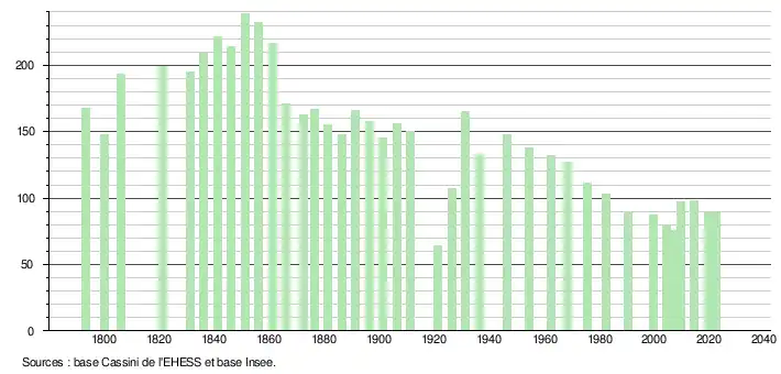 L'évolution du nombre d'habitants est connue à travers les recensements de la population effectués dans la commune depuis 1793. Pour les communes de moins de 10 000 habitants, une enquête de recensement portant sur toute la population est réalisée tous les cinq ans, les populations de référence des années intermédiaires étant quant à elles estimées par interpolation ou extrapolation[24]. Pour la commune, le premier recensement exhaustif entrant dans le cadre du nouveau dispositif a été réalisé en 2004[25].