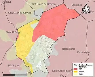 Le retrait-gonflement des sols argileux est susceptible d'engendrer des dommages importants aux bâtiments en cas d’alternance de périodes de sécheresse et de pluie. 70 % de la superficie communale est en aléa moyen ou fort (59,3 % au niveau départemental et 48,5 % au niveau national). Sur les 626 bâtiments dénombrés sur la commune en 2019, 192 sont en aléa moyen ou fort, soit 31 %, à comparer aux 85 % au niveau départemental et 54 % au niveau national. Une cartographie de l'exposition du territoire national au retrait gonflement des sols argileux est disponible sur le site du BRGM[16],[Carte 2].