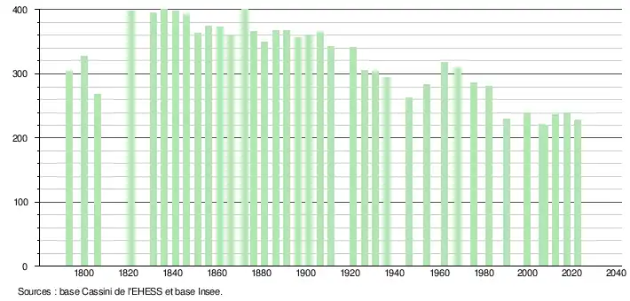 L'évolution du nombre d'habitants est connue à travers les recensements de la population effectués dans la commune depuis 1793. Pour les communes de moins de 10 000 habitants, une enquête de recensement portant sur toute la population est réalisée tous les cinq ans, les populations de référence des années intermédiaires étant quant à elles estimées par interpolation ou extrapolation[29]. Pour la commune, le premier recensement exhaustif entrant dans le cadre du nouveau dispositif a été réalisé en 2007[30].