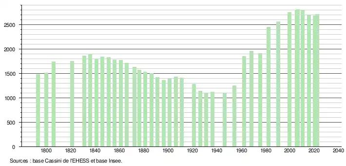 L'évolution du nombre d'habitants est connue à travers les recensements de la population effectués dans la commune depuis 1793. Pour les communes de moins de 10 000 habitants, une enquête de recensement portant sur toute la population est réalisée tous les cinq ans, les populations de référence des années intermédiaires étant quant à elles estimées par interpolation ou extrapolation[34]. Pour la commune, le premier recensement exhaustif entrant dans le cadre du nouveau dispositif a été réalisé en 2005[35].