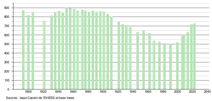L'évolution du nombre d'habitants est connue à travers les recensements de la population effectués dans la commune depuis 1793. Pour les communes de moins de 10 000 habitants, une enquête de recensement portant sur toute la population est réalisée tous les cinq ans, les populations de référence des années intermédiaires étant quant à elles estimées par interpolation ou extrapolation[19]. Pour la commune, le premier recensement exhaustif entrant dans le cadre du nouveau dispositif a été réalisé en 2008[20].