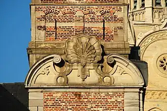 Le troisième niveau, plus étroit, est édifié en briques également cantonnées de pilastres à bossages. Sa face sud arbore les armoiries de la ville, ajoutées en 1930[3]. Chacune des trois faces visibles de ce niveau est ornée d'un fronton brisé orné de volutes et d'une coquille Saint-Jacques.