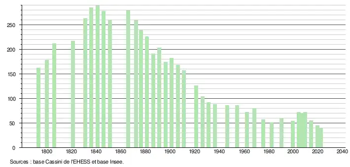 L'évolution du nombre d'habitants est connue à travers les recensements de la population effectués dans la commune depuis 1793. Pour les communes de moins de 10 000 habitants, une enquête de recensement portant sur toute la population est réalisée tous les cinq ans, les populations de référence des années intermédiaires étant quant à elles estimées par interpolation ou extrapolation[19]. Pour la commune, le premier recensement exhaustif entrant dans le cadre du nouveau dispositif a été réalisé en 2004[20].