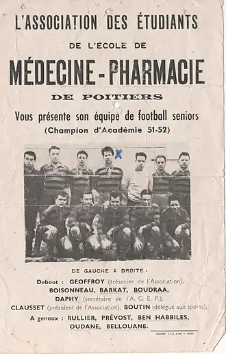 Loin de renoncer à son rêve de devenir médecin, il décide de partir effectuer ses études à la faculté de médecine de Poitiers en 1947[6]. Pour financer ses études, il reçoit l'aide d'une association caritative de Tlemcen, ainsi qu'un prêt d'honneur et l'aide de son frère Abdelkader Boudraâ. Il effectue également des petits emplois au CROUS et il devient suppléant en éducation physique et sportive dans un centre de formation professionnelle. Il signe une licence de football au club professionnel local. Il rencontre maître Belabbas, qui est également issu d'un milieu pauvre. Tout comme Boudraâ, il décroche son diplôme (d'avocat). Une amitié naît entre les deux hommes, qui sera consolidée par leur engagement dans la guerre de libération nationale une dizaine d'années plus tard.