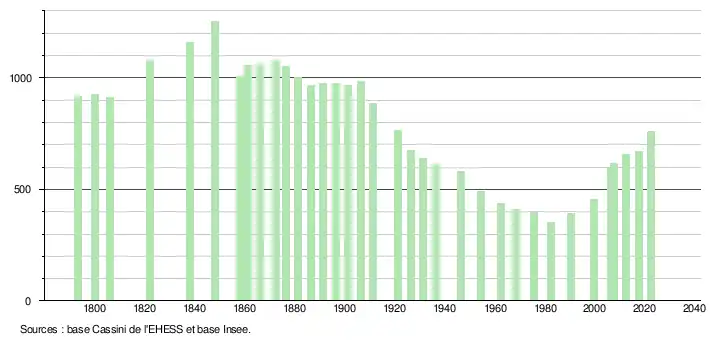 L'évolution du nombre d'habitants est connue à travers les recensements de la population effectués dans la commune depuis 1793. Pour les communes de moins de 10 000 habitants, une enquête de recensement portant sur toute la population est réalisée tous les cinq ans, les populations de référence des années intermédiaires étant quant à elles estimées par interpolation ou extrapolation[20]. Pour la commune, le premier recensement exhaustif entrant dans le cadre du nouveau dispositif a été réalisé en 2007[21].