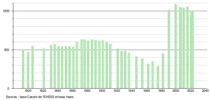 L'évolution du nombre d'habitants est connue à travers les recensements de la population effectués dans la commune depuis 1793. Pour les communes de moins de 10 000 habitants, une enquête de recensement portant sur toute la population est réalisée tous les cinq ans, les populations de référence des années intermédiaires étant quant à elles estimées par interpolation ou extrapolation[23]. Pour la commune, le premier recensement exhaustif entrant dans le cadre du nouveau dispositif a été réalisé en 2005[24].