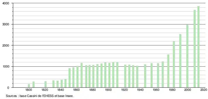 L'évolution du nombre d'habitants est connue à travers les recensements de la population effectués dans la commune depuis 1800. À partir du , les populations légales des communes sont publiées annuellement dans le cadre d'un recensement qui repose désormais sur une collecte d'information annuelle, concernant successivement tous les territoires communaux au cours d'une période de cinq ans. Pour les communes de moins de 10 000 habitants, une enquête de recensement portant sur toute la population est réalisée tous les cinq ans, les populations légales des années intermédiaires étant quant à elles estimées par interpolation ou extrapolation[11]. Pour la commune, le premier recensement exhaustif entrant dans le cadre du nouveau dispositif a été réalisé en 2008[12],[Note 1].