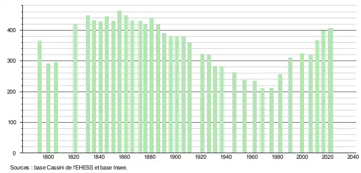 | L'évolution du nombre d'habitants est connue à travers les recensements de la population effectués dans la commune depuis 1793. Pour les communes de moins de 10 000 habitants, une enquête de recensement portant sur toute la population est réalisée tous les cinq ans, les populations de référence des années intermédiaires étant quant à elles estimées par interpolation ou extrapolation[28]. Pour la commune, le premier recensement exhaustif entrant dans le cadre du nouveau dispositif a été réalisé en 2006[29]. En 2022, la commune comptait 406 habitants[Note 4], en évolution de +2,01 % par rapport à 2016 (Lot : +1,31 %, France hors Mayotte : +2,11 %). |