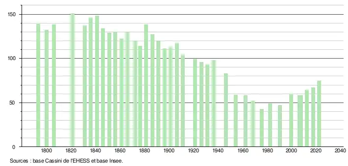 L'évolution du nombre d'habitants est connue à travers les recensements de la population effectués dans la commune depuis 1793. Pour les communes de moins de 10 000 habitants, une enquête de recensement portant sur toute la population est réalisée tous les cinq ans, les populations de référence des années intermédiaires étant quant à elles estimées par interpolation ou extrapolation[19]. Pour la commune, le premier recensement exhaustif entrant dans le cadre du nouveau dispositif a été réalisé en 2007[20].