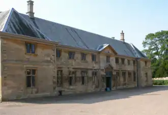 Le hall d'entrée principale, les salles de réceptions et les chambres à coucher familiales étaient situées au rez-de-chaussée et au premier étage au-dessus d'un sous-sol semi-enterré contenant les pièces des serviteurs[16]. Les deux entrées principales du manoir situées au centre des façades Nord et Sud sont accessibles via des escaliers externes. À l'origine, du côté Sud l'escalier était composé d'une double volée et du côté Nord d'une étroite volée, mais chacun a été remplacé depuis par une seule large volée de marches[20]