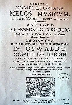 - Opus IV Musica montana in monte Carmelo composita, cantata in monte Domini, 1. 2. 3. vocibus, & unum Tantum ergo. 4. voc. & 2, 3 vel 5. instrumentis, Anvers 1677 (cantates in monte Domini pour 1–3 voix et Tantum ergo pour 4 voix et 2, 3 ou 5 instruments)