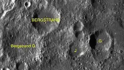 Les cratères dits satellites sont de petits cratères situés à proximité du cratère principal, ils sont nommés du même nom mais accompagné d'une lettre majuscule complémentaire (même si la formation de ces cratères est indépendante de la formation du cratère principal). Par convention ces caractéristiques sont indiquées sur les cartes lunaires en plaçant la lettre sur le point le plus proche du cratère principal. Liste des cratères satellites de Bergstrand [5] :