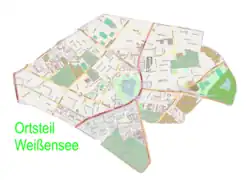 Le cœur du quartier, un ancien village-rue et domaine seigneurial, se situe sur la rive orientale d'un petit lac, le Weißer See appartenant à une chaîne de lacs glaciaires qui s'étend des hauteurs du plateau.