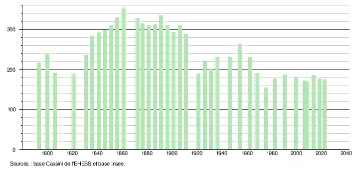 L'évolution du nombre d'habitants est connue à travers les recensements de la population effectués dans la commune depuis 1793. Pour les communes de moins de 10 000 habitants, une enquête de recensement portant sur toute la population est réalisée tous les cinq ans, les populations de référence des années intermédiaires étant quant à elles estimées par interpolation ou extrapolation[26]. Pour la commune, le premier recensement exhaustif entrant dans le cadre du nouveau dispositif a été réalisé en 2008[27].