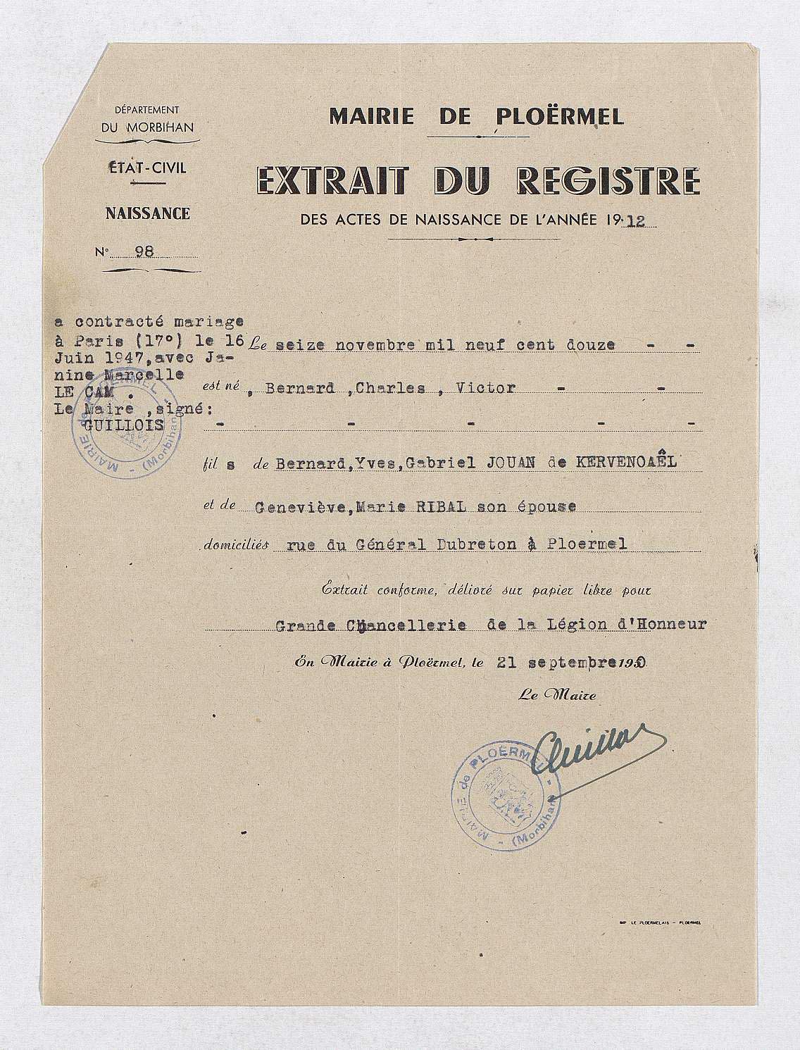 - ↑ Extrait du registre des actes de naissance de l'année 1912 de la mairie de Ploërmel sur la base Léonore