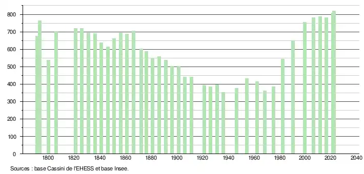 L'évolution du nombre d'habitants est connue à travers les recensements de la population effectués dans la commune depuis 1791. Pour les communes de moins de 10 000 habitants, une enquête de recensement portant sur toute la population est réalisée tous les cinq ans, les populations de référence des années intermédiaires étant quant à elles estimées par interpolation ou extrapolation[24]. Pour la commune, le premier recensement exhaustif entrant dans le cadre du nouveau dispositif a été réalisé en 2006[25].