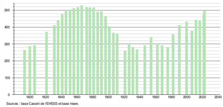 - ↑ Population municipale de référence en vigueur au 1er janvier 2025, millésimée 2022, définie dans les limites territoriales en vigueur au 1er janvier 2024, date de référence statistique : 1er janvier 2022.
