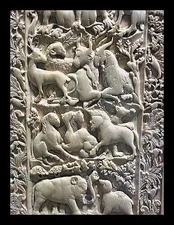 La représentation animale dans l'art médiéval est riche par la diversité des formes artistiques et des animaux représentés, qu'ils soient réels ou imaginaires. Ces représentations médiévales sont grandement influencées par le christianisme : elles sont décoratives, mais surtout symboliques. Les animaux représentent la Création, le Bien et le Mal, Dieu ou le Diable. Ils s'épanouissent dans les églises, sur les vitraux, les bas-reliefs ou les pavages, seuls media d'apprentissage pour l'illettré qui compose la majorité de la société médiévale[1]. Ainsi, on retrouve les animaux sculptés sur les chapiteaux des églises ou les plaques d'ivoires, peints dans les enluminures des manuscrits ou dans des fresques des églises, ainsi que dans des œuvres d'orfèvrerie, les sceaux, les tapisseries et les vitraux.