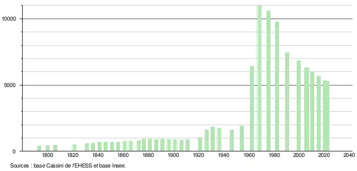 L'évolution du nombre d'habitants est connue à travers les recensements de la population effectués dans la commune depuis 1793. Pour les communes de moins de 10 000 habitants, une enquête de recensement portant sur toute la population est réalisée tous les cinq ans, les populations de référence des années intermédiaires étant quant à elles estimées par interpolation ou extrapolation[24]. Pour la commune, le premier recensement exhaustif entrant dans le cadre du nouveau dispositif a été réalisé en 2005[25].