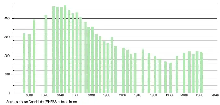 L'évolution du nombre d'habitants est connue à travers les recensements de la population effectués dans la commune depuis 1793. Pour les communes de moins de 10 000 habitants, une enquête de recensement portant sur toute la population est réalisée tous les cinq ans, les populations de référence des années intermédiaires étant quant à elles estimées par interpolation ou extrapolation[31]. Pour la commune, le premier recensement exhaustif entrant dans le cadre du nouveau dispositif a été réalisé en 2006[32].