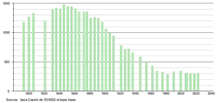L'évolution du nombre d'habitants est connue à travers les recensements de la population effectués dans la commune depuis 1793. Pour les communes de moins de 10 000 habitants, une enquête de recensement portant sur toute la population est réalisée tous les cinq ans, les populations de référence des années intermédiaires étant quant à elles estimées par interpolation ou extrapolation[21]. Pour la commune, le premier recensement exhaustif entrant dans le cadre du nouveau dispositif a été réalisé en 2007[22].