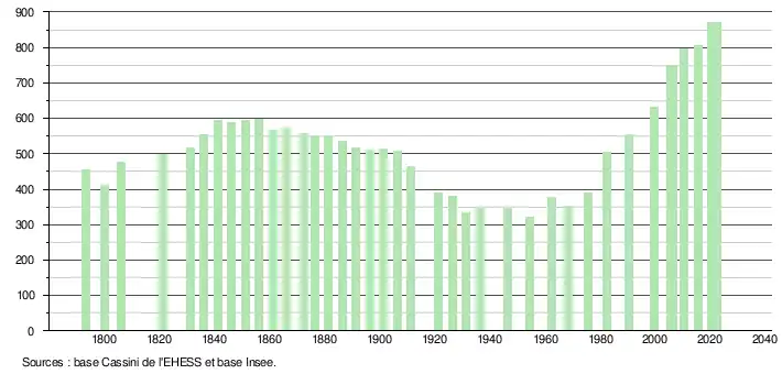 L'évolution du nombre d'habitants est connue à travers les recensements de la population effectués dans la commune depuis 1793. Pour les communes de moins de 10 000 habitants, une enquête de recensement portant sur toute la population est réalisée tous les cinq ans, les populations de référence des années intermédiaires étant quant à elles estimées par interpolation ou extrapolation[18]. Pour la commune, le premier recensement exhaustif entrant dans le cadre du nouveau dispositif a été réalisé en 2005[19].