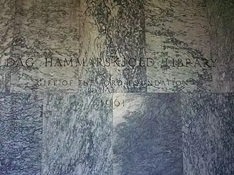 Dag Hammarskjöld, qui était le secrétaire général de l’ONU à l’époque[4], a contribué à obtenir le financement de ce nouveau bâtiment et a surveillé chaque étape de sa construction[4]. La Bibliothèque Dag-Hammarskjöld a été inaugurée le 16 novembre 1961. Cette date correspond environ à deux mois jour pour jour après la mort de Dag Hammarskjöld dans un accident d’avion[4]. La bibliothèque est rebaptisée en son honneur.