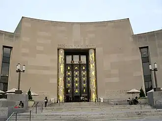 La bibliothèque publique de Brooklyn est l’une des bibliothèques les plus vieilles des États-Unis. La bibliothèque centrale a été fondée en 1941[3]. L'Art Deco des années 40 est le style architectural de cet établissement. Il prend aussi la forme d’un livre ouvert avec des sculptures en bronze à la porte principale[4]. Ces sculptures ont été faites par Thomas Hudson Jones et Carl P. Jennewein[3].