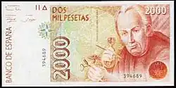 | En 1992, la Banque d'Espagne a publié sa dernière série avant l'introduction de l'Euro. Les billets ont été faits par l'artiste graphique Reinhold Gerstetter et imprimé par la "Fábrica Nacional de Moneda y Timbre". L'objectif de la Banque d'Espagne, la question de cette nouvelle série était de renforcer la sécurité à travers des micro-texte imprimé et indices visible uniquement avec une loupe. Cette série de billets combine des éléments artistiques espagnols et américains pour célébrer en le 500e anniversaire de la découverte de l'Amérique par Christophe Colomb. | ||||||||||||