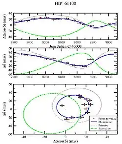 Le photocentre décrit une orbite autour du barycentre qui est homothétique en règle générale à celle de l'étoile la plus brillante mais avec un demi-grand axe pouvant être différent en taille. Les variations de position en coordonnées équatoriales sur le plan tangent du ciel s'écrivent :